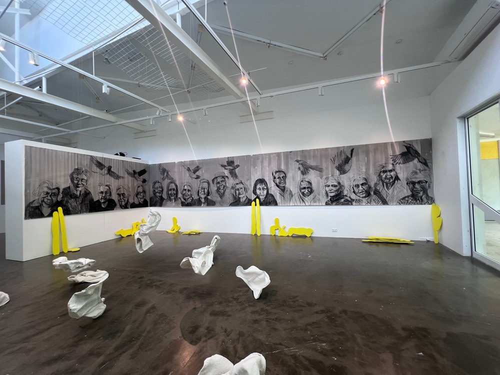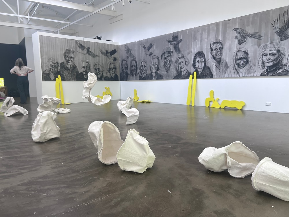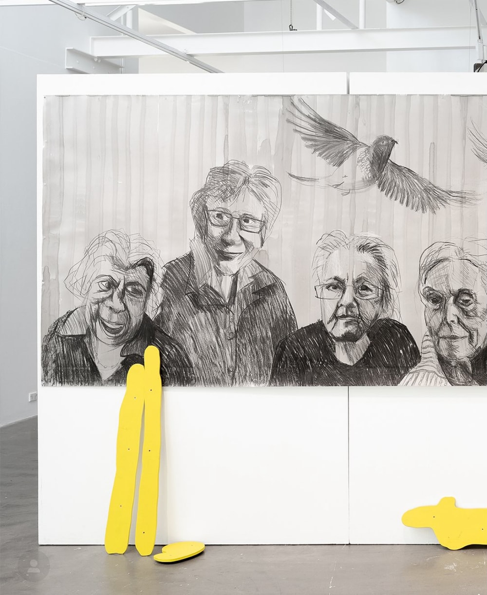 In an installation along two gallery walls, the 18 portraits of SCOOP assert the value, power and presence of women artists late in their lives. They claim back the power of age.